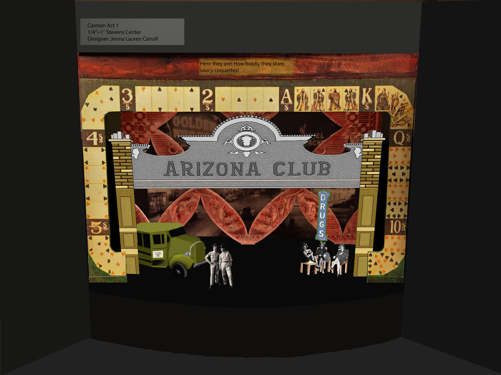 Design of the opera Carmen set in early 1940's Las Vegas. Each act is related to a different playing card suit. Carmen is a show girl-turned-sex worker.